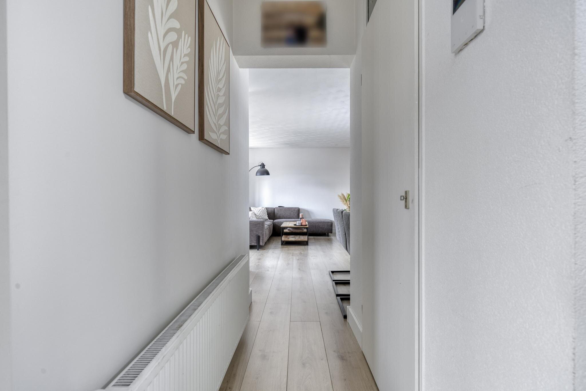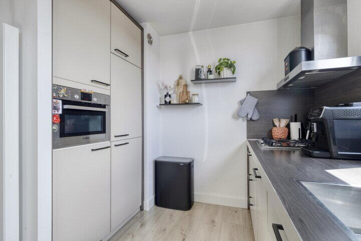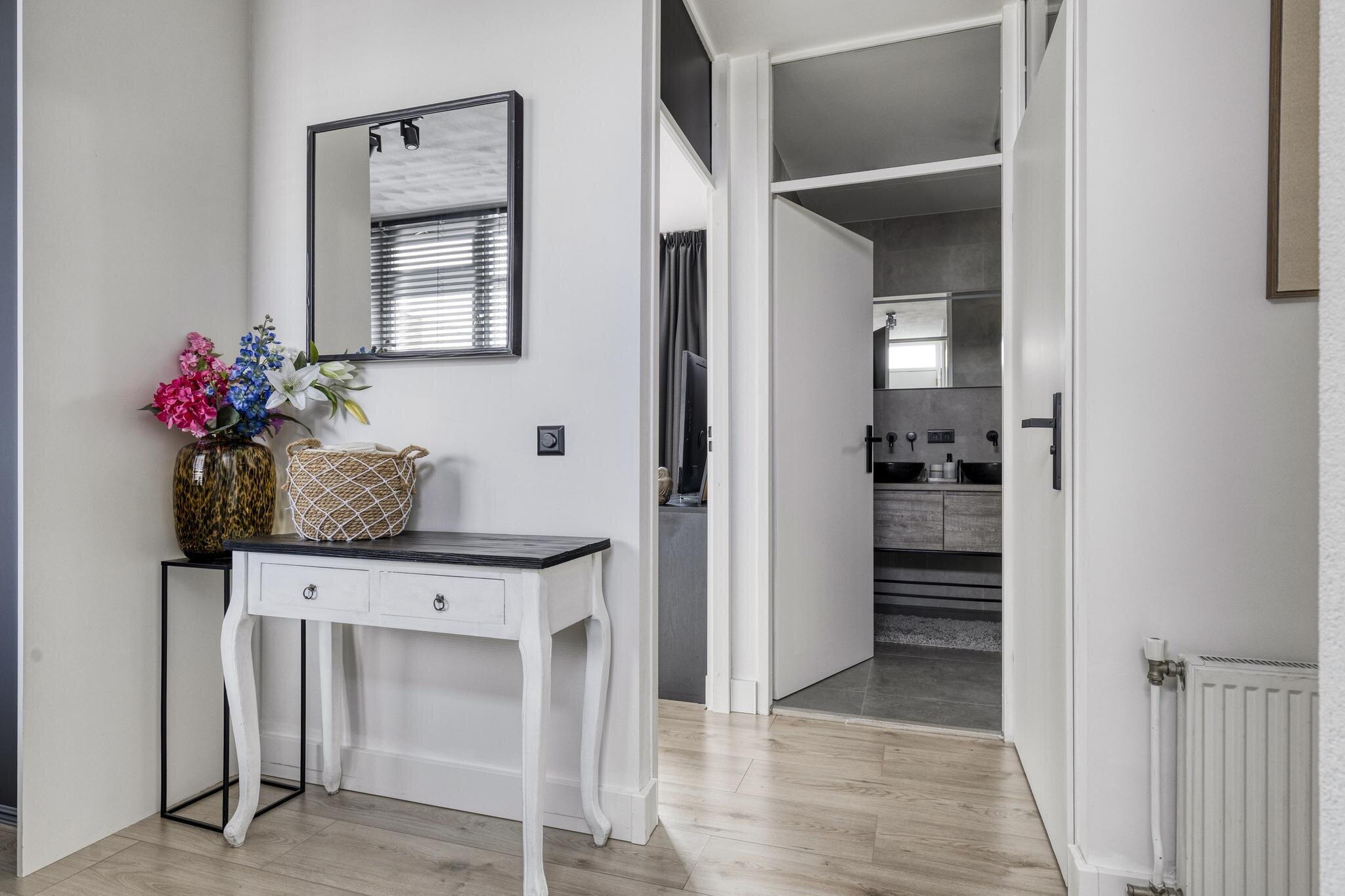 Entree met meterkast, kastenkamer (makkelijk aan te passen naar slaapkamer), lichte woonkamer met toegang tot ruim en zonnig dakterras, moderne open keuken, luxe badkamer met dubbele wastafel en douchecabine, slaapkamer met toegang tot dakterras. Separate berging.